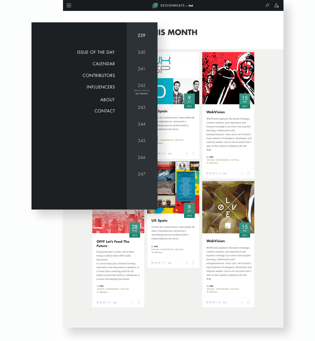 Corporate image design, UX, visual & interaction design. Digital magazine issued by FAD with the goal of providing and spreading quality contents related to design, from a cross-disciplinary and global perspective.